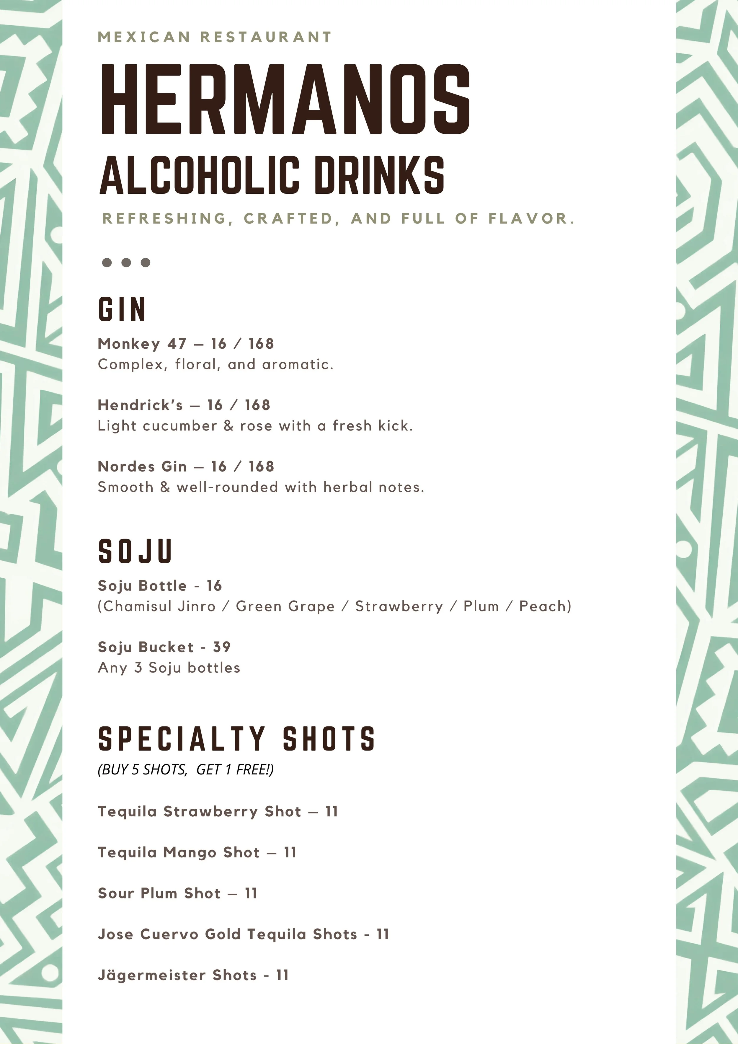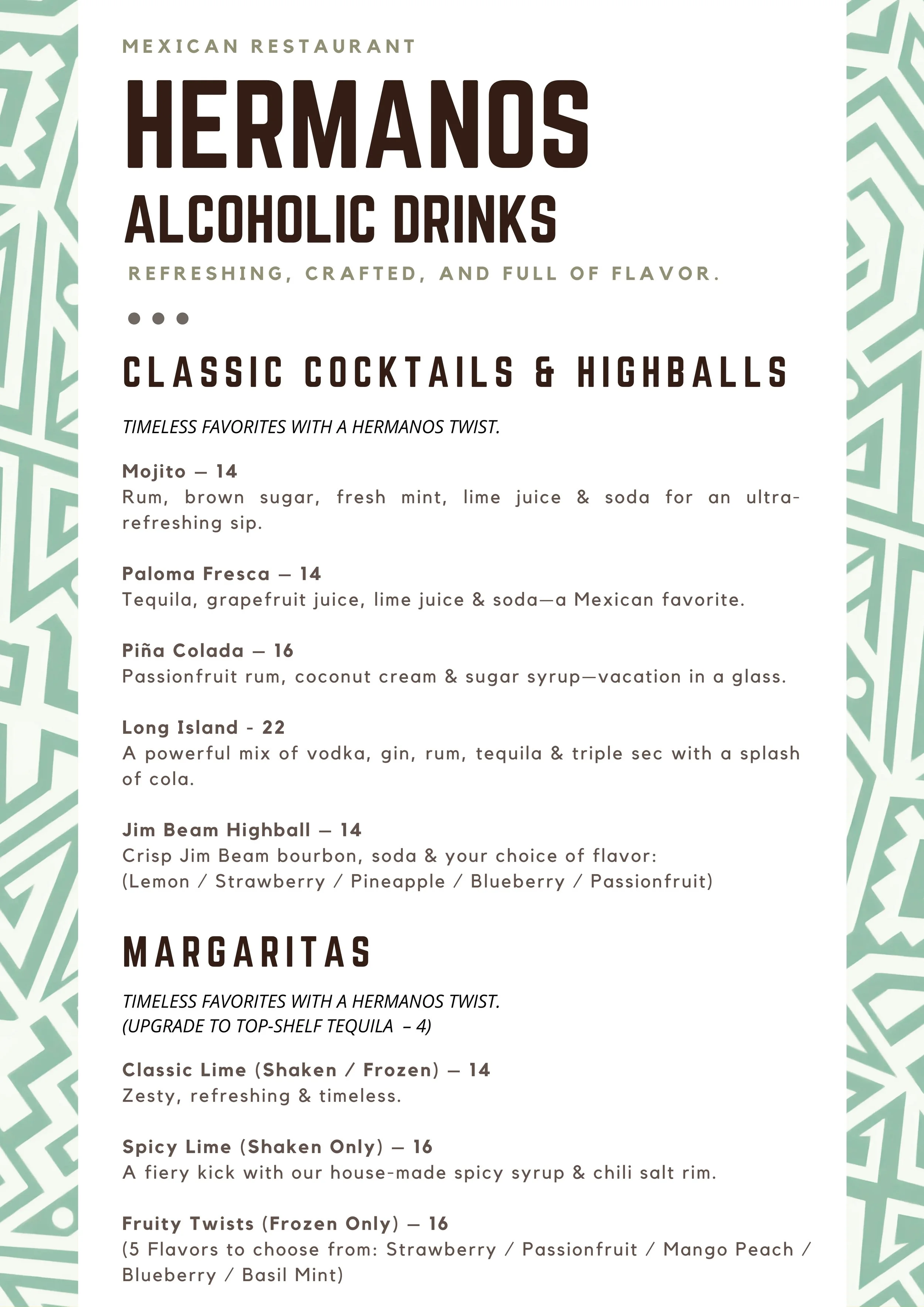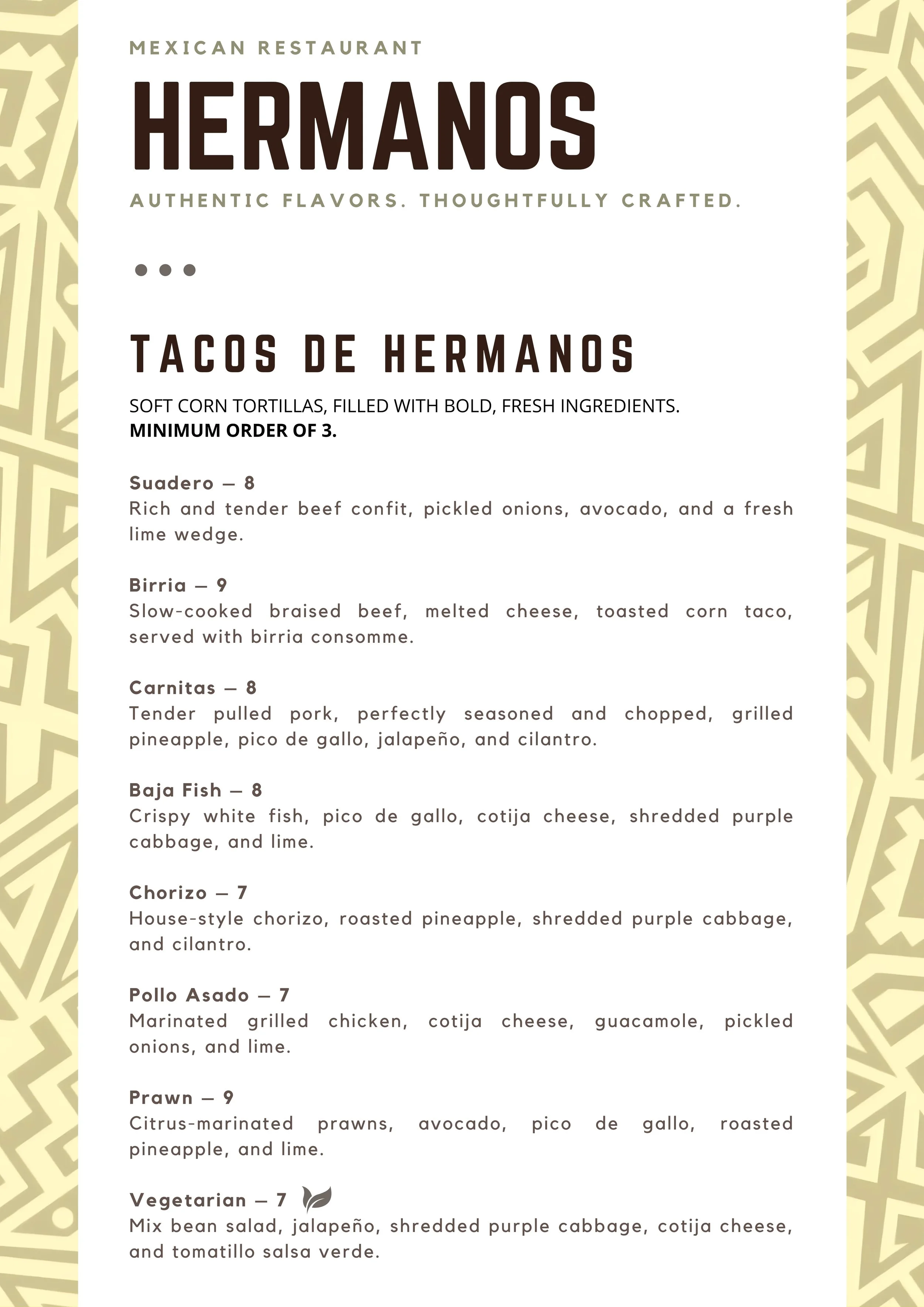 Welcome to Hermanos, where bold flavors, handcrafted drinks, and good vibes come together! Our menu is a fusion of Mexican and Western flavors, bringing you everything from sizzling tacos to signature cocktails that hit just right.